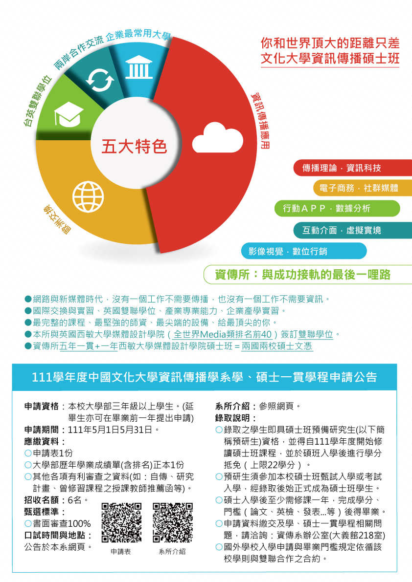 申請暨書審資料:申請表(請掃qr-code)、歷年成績單(學生專區列印下載)、有利資料(如:自傳、研究計畫、曾修習課程之授課教師推薦函等)